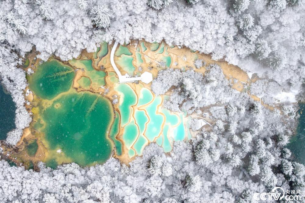 10月31日,四川省阿坝藏族羌族自治州九寨沟县漳扎镇,入秋以来的第一场雪,整个景区2600多个彩池被白雪覆盖,池底“龙鳞纹”在雪与水的映衬下,蓝绿纹路愈发清晰,钙化池在白雪的映衬下美如仙境。
